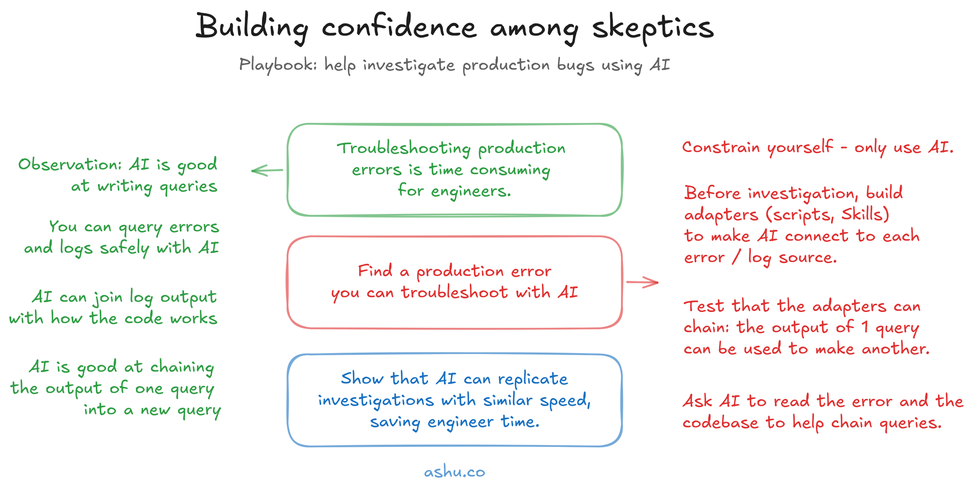 Pick one process to automate. Show concrete examples of its benefits. Don't try to overhaul everything. And remember, it's not just code generation. I gave the example of troubleshooting production errors. It could also be: a planning template, a test generation step, a deployment checklist, an observability alert summary, or updating JIRA tickets. Isolated wins build confidence, both yours and the team's. They also give you concrete stories to share with leadership when they ask for evidence that the investment is working, and can be cross-pollinated across the wider organization.