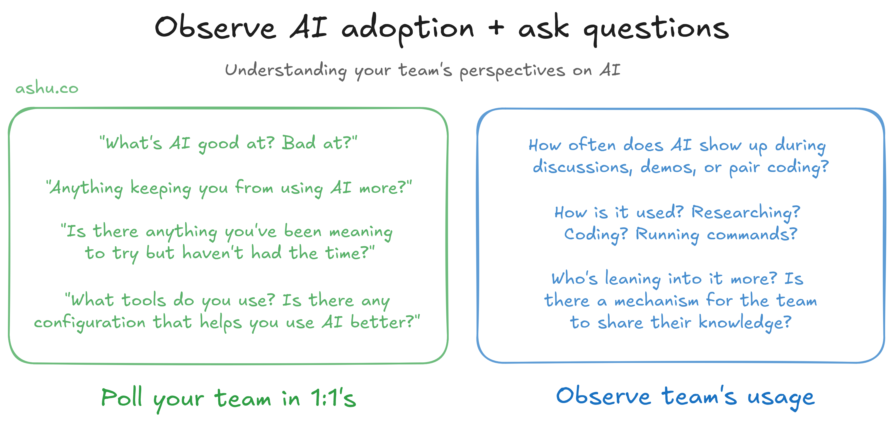 As a practical experiment, try speaking with a sample of the team in your 1:1s about how they use AI, and perhaps collaborate with them on a project. It's more effective to see how your team uses AI (e.g., during a demo, presentation, or pair coding) than to verbally poll them. That way you can see how they're using AI, rather than a simple yes/no poll.