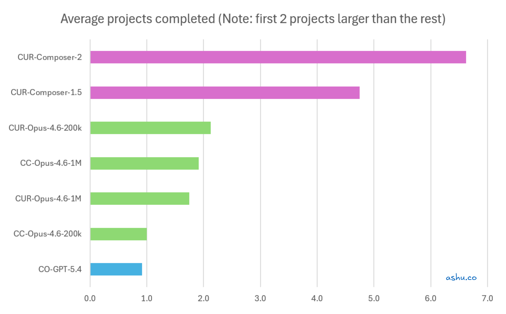 In all charts, the Composer models were at least 2x faster than the other models. Since it finished the first 2 larger projects, it was able to race ahead to do all the small projects at the end. On the other hand, this made the other models seem like they did less. But if you have a mix of small/large projects, Composer's lead may pull it ahead.