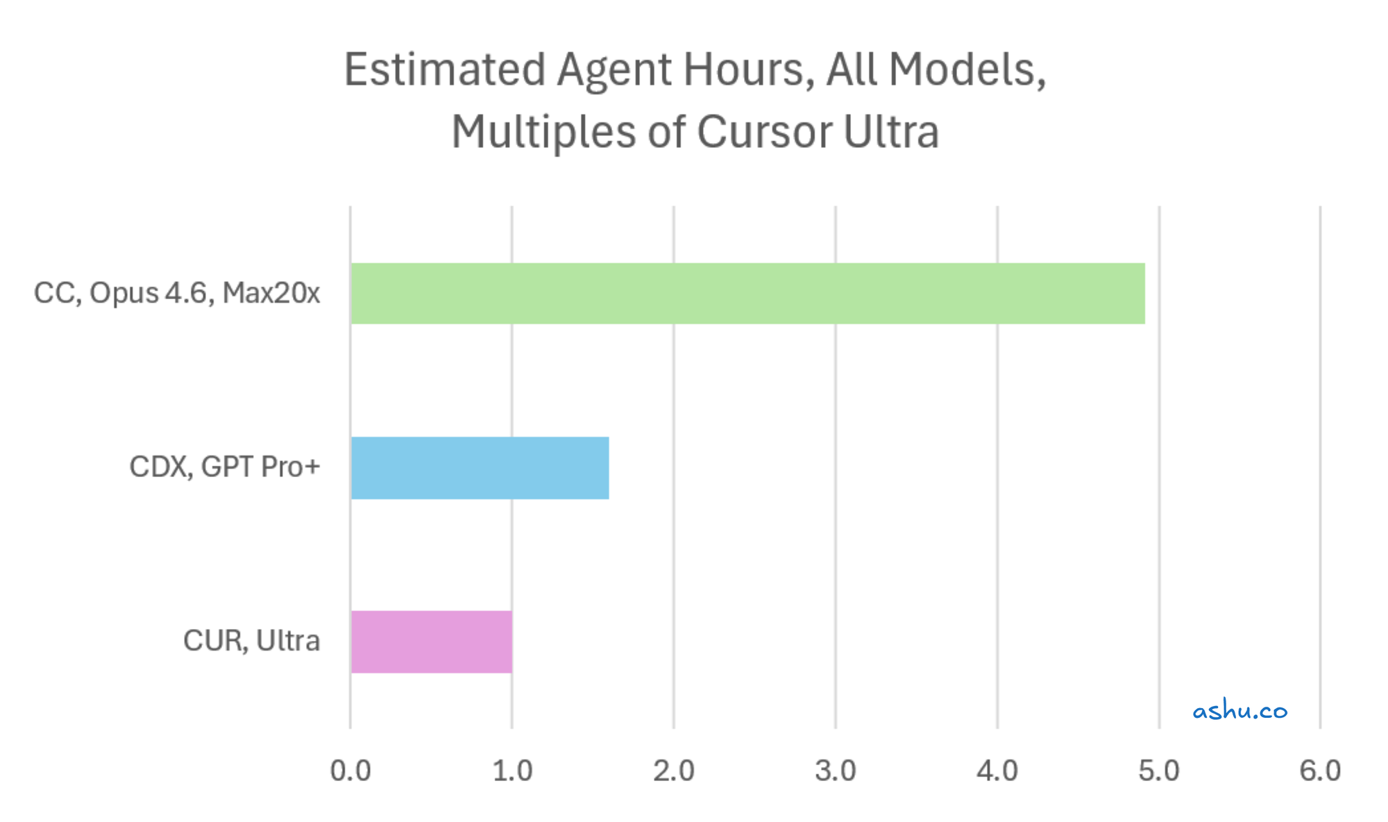 5. Codex is a real contender at ~1.6x Cursor's capacity, and a number of engineers I know and follow online have been enjoying Codex for its knack at solving harder problems that Opus 4.6 may have challenges with. And you get the SOTA model for all the agent-hours.