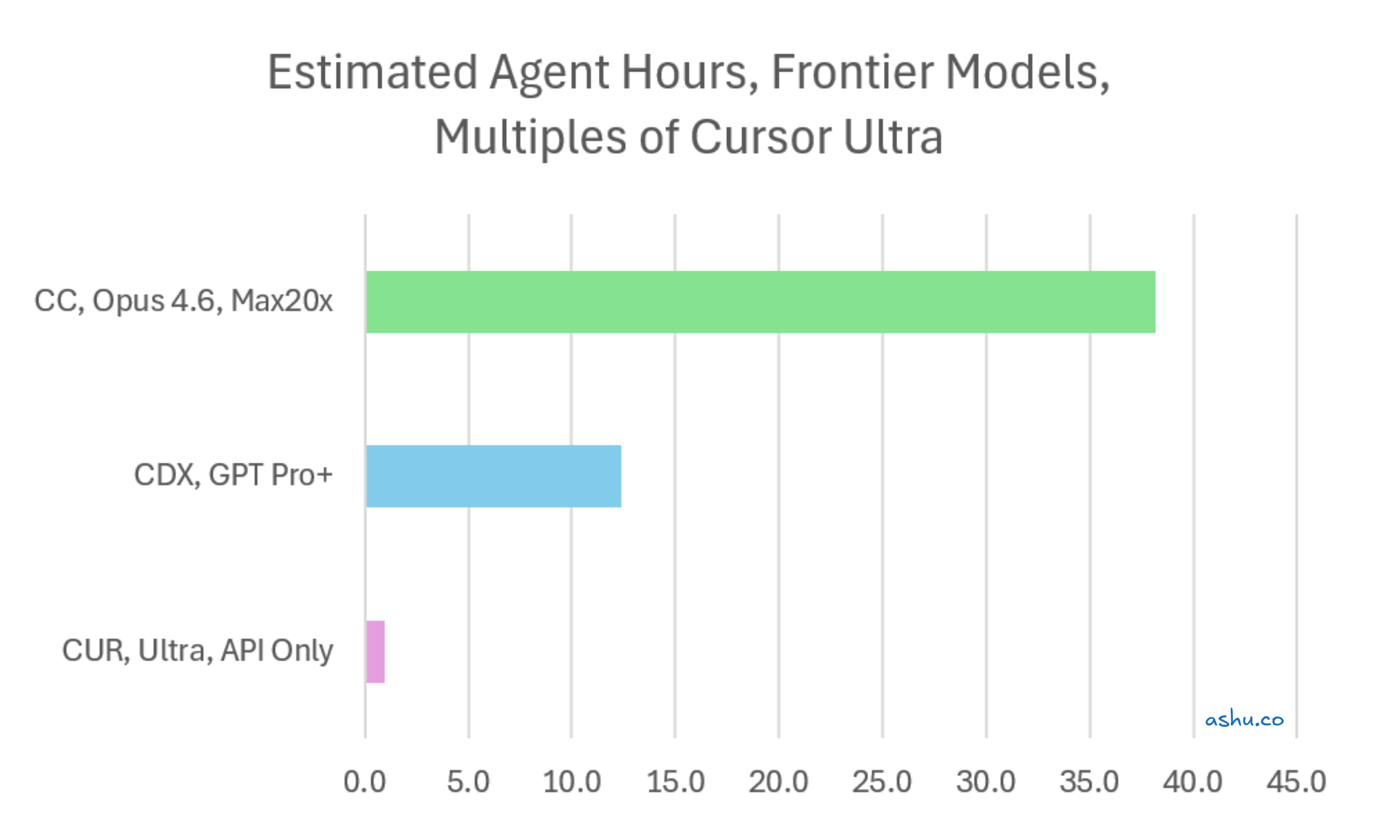 That's a 38x difference in agent-hours (ignoring the vast amount of Composer 2 tokens that Cursor provides). For engineers exclusively focused on frontier model access for complex reasoning (Opus, GPT, Gemini) and you're comparing Claude Code to Cursor, this is the source of their surprise.