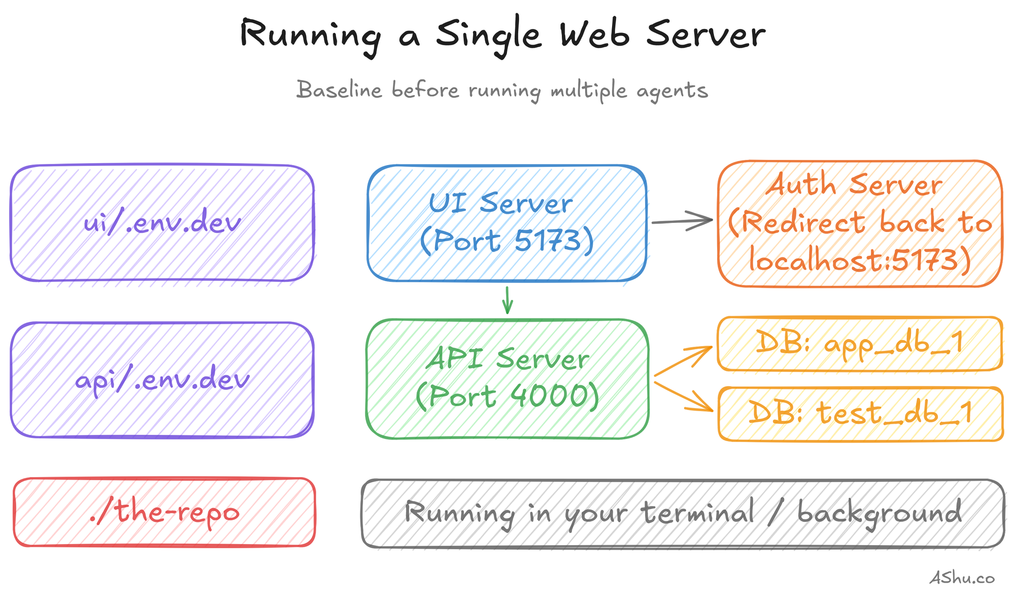 But manually managing these environment files, spinning databases up/down was untenable. I was creating and tearing down worktrees several times per day, and it's tedious to manually keep track of which ports and database names are free, copying .env files everywhere.