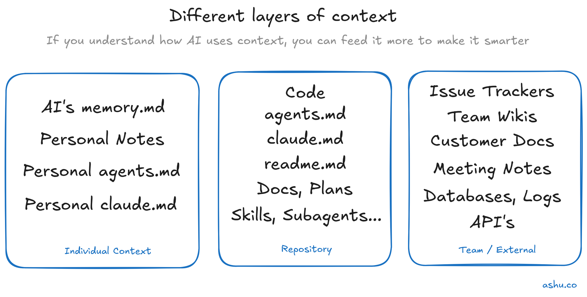 This is a bigger source of inefficiency than it appears. Not everyone realizes that many hallucination patterns can be fixed with better context. (By context, I'm basically talking about code, docs and additional markdown files.) And those who do know often haven't had the time to pay attention to how context is actually structured across their tools. There's a growing stack of context layers: AGENTS.md files, skills, subagents, team-shared vs. individual context, memory architecture, code indexers, connections to databases and wikis and issue trackers.