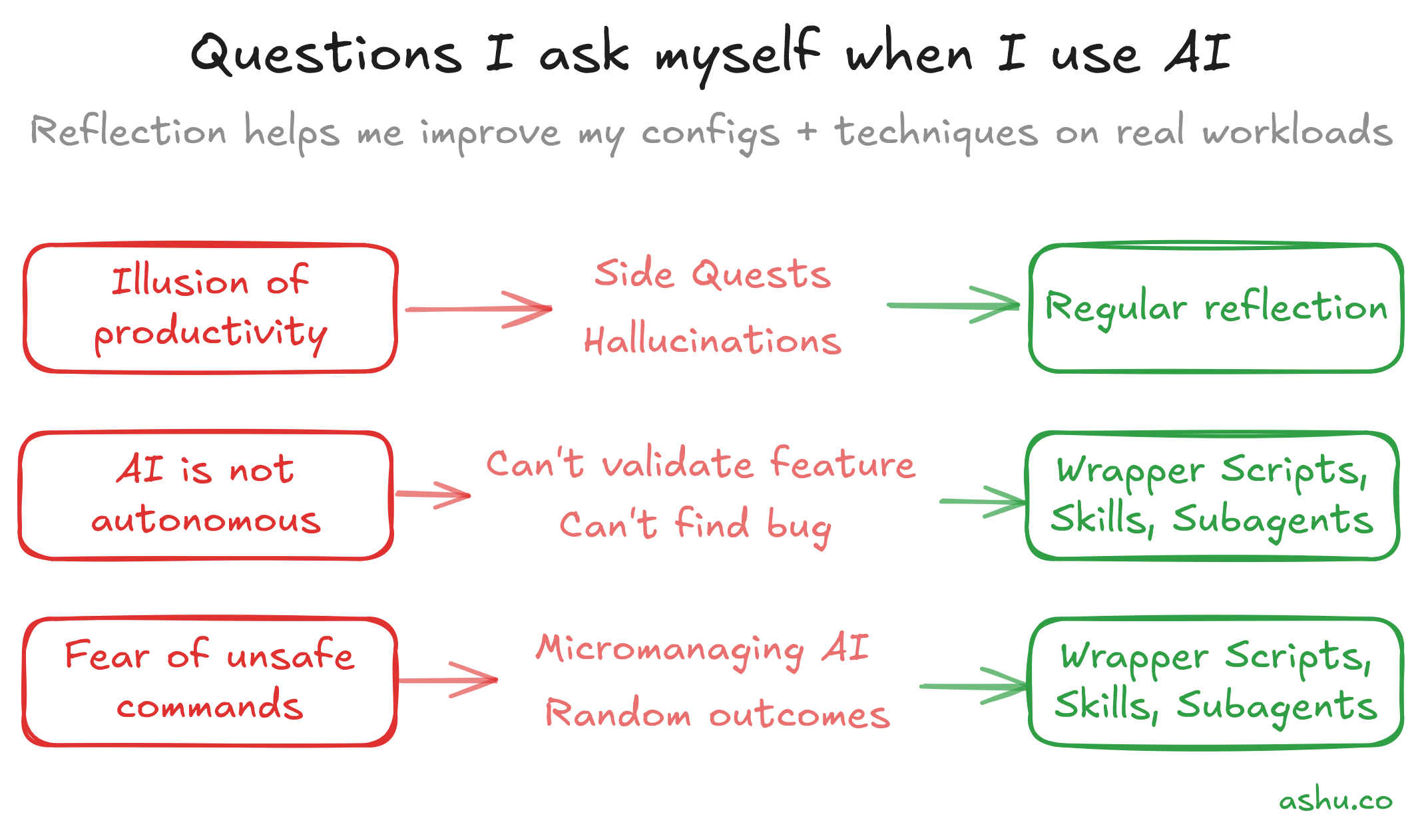 bashcommands, ask AI to write a script you can review. I find AI helpful for sysadmin/SRE work, but I have to monitor it closely — no background agents here. Watching commands scroll by is risky, so I ask the agent to write them into a script I can review first. Then as a bonus, I get a script that is reusable. - Extracting repeat database or log queries into a script. When I was troubleshooting customer issues, I often ran a few Postgres database queries or fetched a few logs related to some Lambdas. This was tedious, but I also didn't want AI to be running PG or AWS Lambda commands by itself. So I wrote scripts like